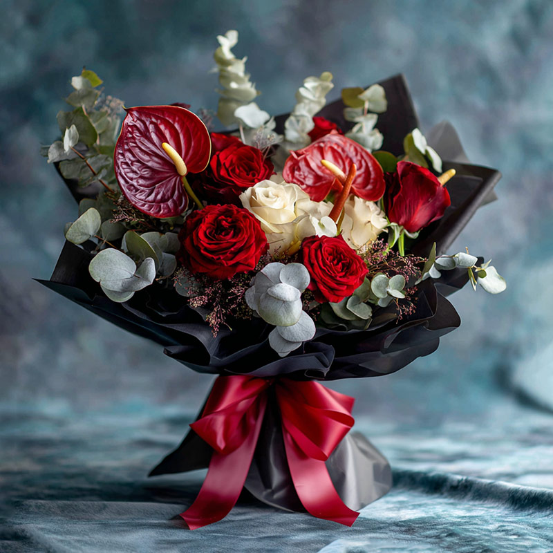 這束花是心跳凝成的火焰,紅玫瑰如熾熱的誓言,在暗夜中綻放著最濃烈的愛意。紅掌舒展成心形的烙印,白玫瑰似月光灑落的清輝,銀葉桉的灰綠枝葉如星河流轉的軌跡。黑色包裝紙裹住這份「緋紅密語」,紅絲帶繫成命運的結,在藍灰暮色前燃燒成永生不滅的「紅花」印記。