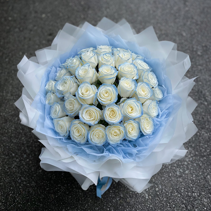 這束花是冬日與湖光的私語,白玫瑰如初雪凝成的詩篇,每一片花瓣邊緣都暈染著冰藍的夢境。淺藍紗紙似薄霧輕攏,純白包裝若雲絮疊疊,在深灰路面的映襯下更顯空靈。俯視的晨光裡,這份「雪吻冰藍」靜靜綻放,彷彿將整個冬季最溫柔的告白都封存在這捧「凝眸初雪」中。